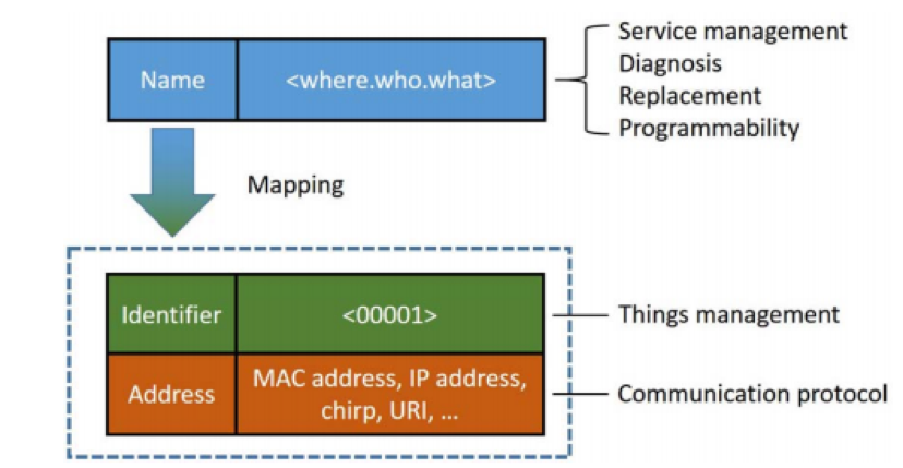 命名方案對于編程、尋址、事物識別和數(shù)據(jù)通信非常重要,但是在邊緣計算中還沒有行之有效的數(shù)據(jù)處理方式。邊緣計算中事物的通信是多樣的,可以依靠wifi、藍牙、2.4g等通信技術,因此,僅僅依靠tcp/ip協(xié)議棧并不能滿足這些異構的事物之間進行通信。邊緣計算的命名方案需要處理事物的移動性,動態(tài)的網(wǎng)絡拓撲結構,隱私和安全保護,以事物的可伸縮性。傳統(tǒng)的命名機制如DNS(域名解析服務)、URI(統(tǒng)一資源標志符)都不能很好的解決動態(tài)的邊緣網(wǎng)絡的命名問題。目前正在提出的NDN(命名分發(fā)網(wǎng)絡)解決此類問題也有一定的局限性。在一個相對較小的網(wǎng)絡環(huán)境中,我們提出一種解決方案,如圖3所示,我們描述一個事物的時間、地點以及正在做的事情,這種統(tǒng)一的命名機制使得管理變得非常容易。當然,當環(huán)境上升到城市的高度的時候,這種命名機制可能就不是很合適了,還可以進行進一步的討論。