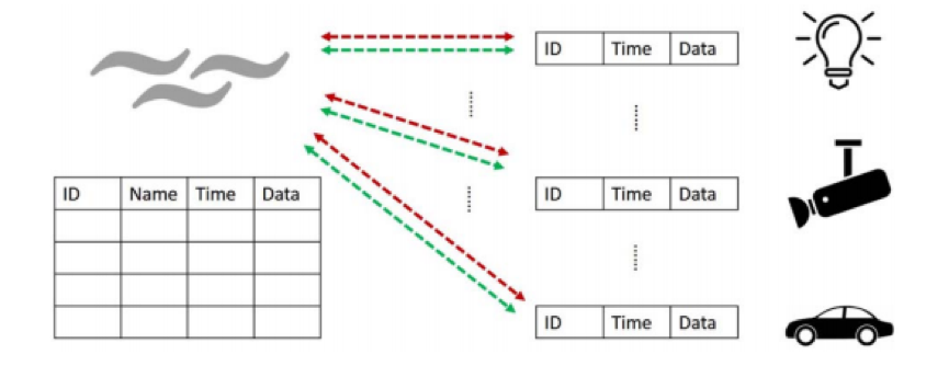 在物聯(lián)網(wǎng)環(huán)境中會有大量的數(shù)據(jù)生成,并且由于物聯(lián)網(wǎng)網(wǎng)絡的異構環(huán)境,生成的數(shù)據(jù)是各種格式的,把各種各樣的數(shù)據(jù)格式化對邊緣計算來說是一個挑戰(zhàn)。同時,網(wǎng)絡邊緣的大部分事物只是周期性的收集數(shù)據(jù),定期把收集到的數(shù)據(jù)發(fā)送給網(wǎng)關,而網(wǎng)關中的存儲是有限的,他只能存儲最新的數(shù)據(jù),因此邊緣結點的數(shù)據(jù)會被經(jīng)常刷新。利用集成的數(shù)據(jù)表來存儲感興趣的數(shù)據(jù),表內部的結構可以如圖4所示,用id、時間、名稱、數(shù)據(jù)等來表示數(shù)據(jù)。