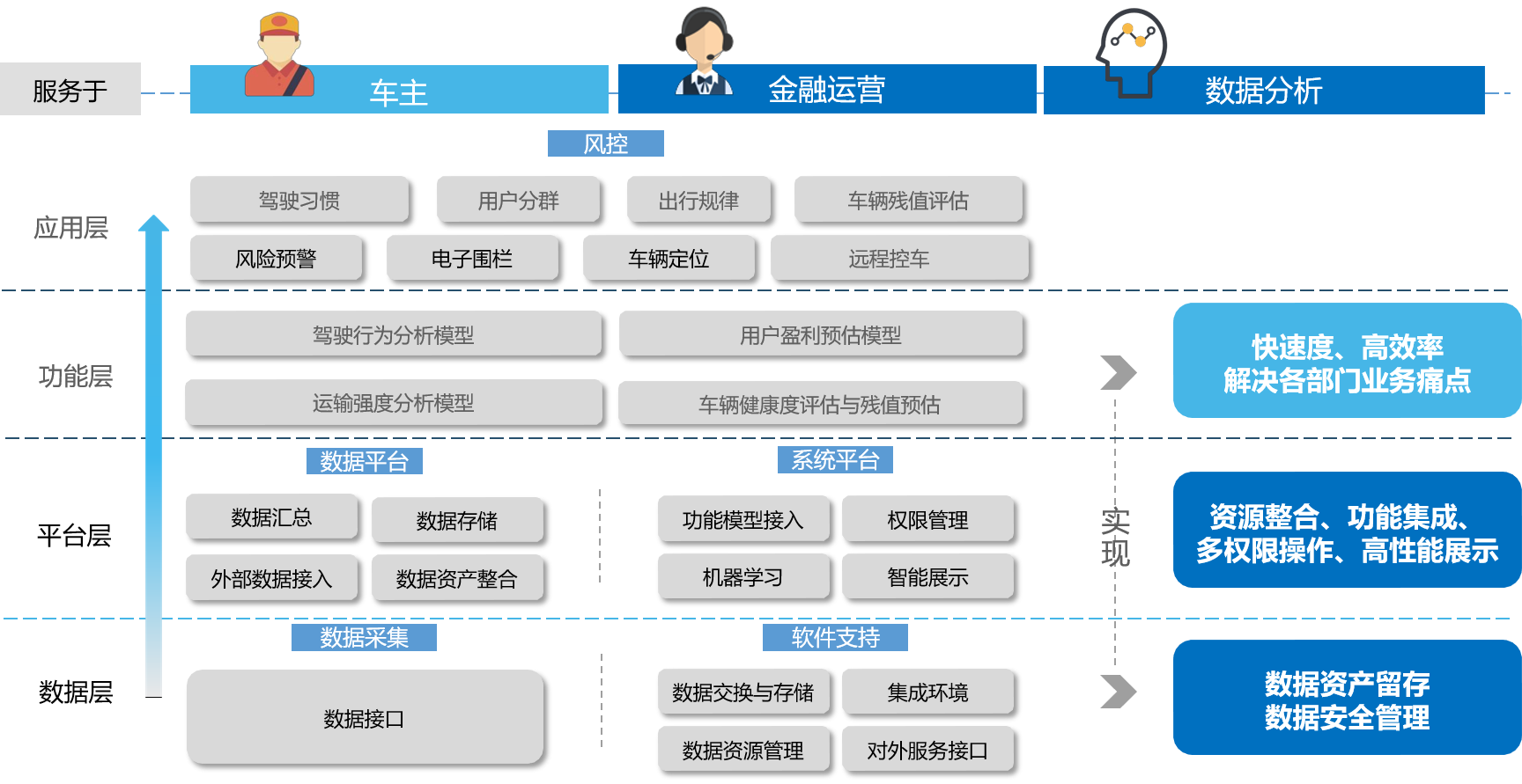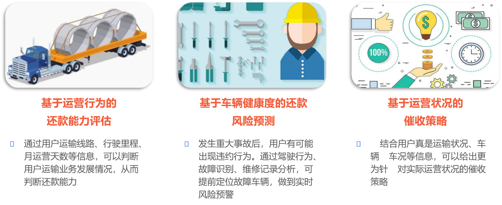 車聯(lián)網(wǎng)數(shù)據(jù)風(fēng)控方案,可以及時掌握用戶運(yùn)營狀況、評估盈利與還款能力, 將傳統(tǒng)的違約后被動催收轉(zhuǎn)變?yōu)檫€款前提前預(yù)警,催收工作更主動,風(fēng)險更可控。