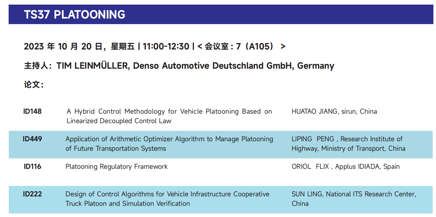 經(jīng)過ITS國際組委會的專業(yè)遴選,該論文成功入選第29屆智能交通世界大會。10月20日上午,斯?jié)櫶炖蕦⑹苎麉⒓蛹夹g(shù)論文會議:TS37 Platooning,屆時將對論文內(nèi)容進(jìn)行技術(shù)解讀,并介紹斯?jié)櫶炖试?/span>V2X網(wǎng)聯(lián)環(huán)境下車輛列隊行駛方面所做的相關(guān)工作。