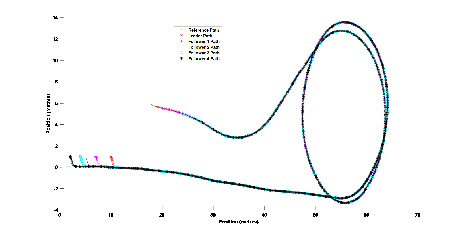 由模型的仿真結(jié)果可以看出,車隊中各個車輛的縱向速度、橫向方向盤轉(zhuǎn)角能夠保持比較好的一致性,路徑跟蹤也取得了比較好的效果,驗證了本論文所提出的混合控制算法的有效性。