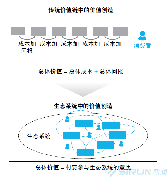 除了從追求“連接”到評估“價值”的思維轉變,萬物運營商還應意識到,整個價值體系正在發(fā)生重構,從單向的“價值鏈”演進為多維綜合的“價值網絡”。