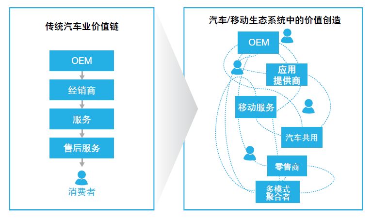 在新型的汽車/移動生態(tài)系統(tǒng)中,價值將與消費者從整個移動體驗和相關服務中獲得的效用掛鉤,而不是來自作為交通工具的汽車本身固有的價值。價值的創(chuàng)造反映了整個客戶體驗的質量,客戶體驗越好,創(chuàng)造的價值就越多。