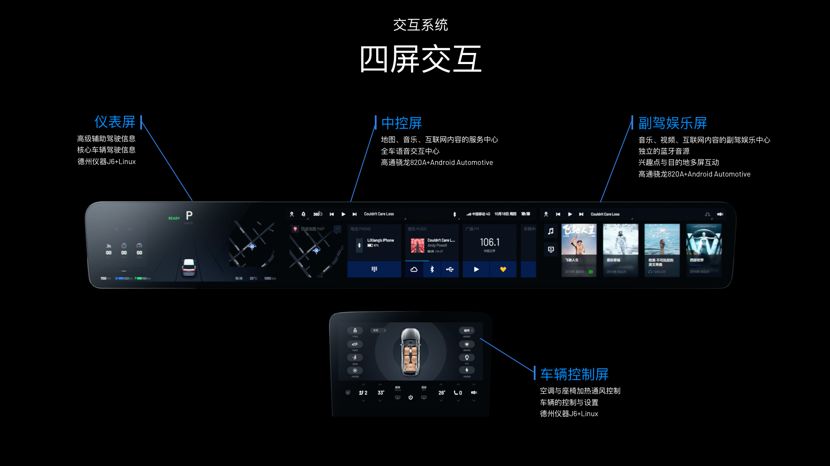 此外,范皓宇介紹,該系統(tǒng)的最大特點(diǎn)是通過四屏交互的方式將堆疊在一起的應(yīng)用拆分。駕駛員前方的儀表屏僅顯示車輛信息和ADAS,使駕駛員的注意力不被過度分散。副駕駛設(shè)置了專屬的娛樂屏,并有獨(dú)立的藍(lán)牙,與駕駛員互不干擾。另外兩塊屏幕分別是中控屏幕和車輛控制屏。中控屏主要用于集成應(yīng)用,而位于傳統(tǒng)空調(diào)控制區(qū)域的車輛控制屏單獨(dú)設(shè)立一塊屏幕,則是因?yàn)檫@是最用戶最高頻、剛需的功能,獨(dú)立屏幕可以讓用戶對(duì)空調(diào)的控制更加簡單、便捷。