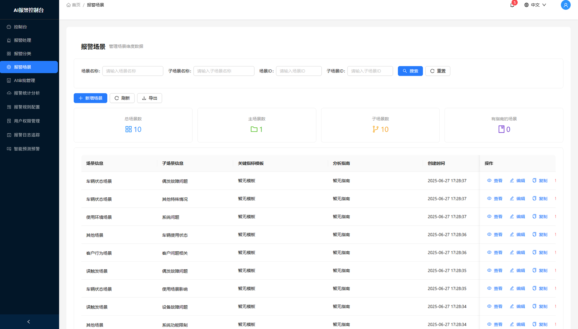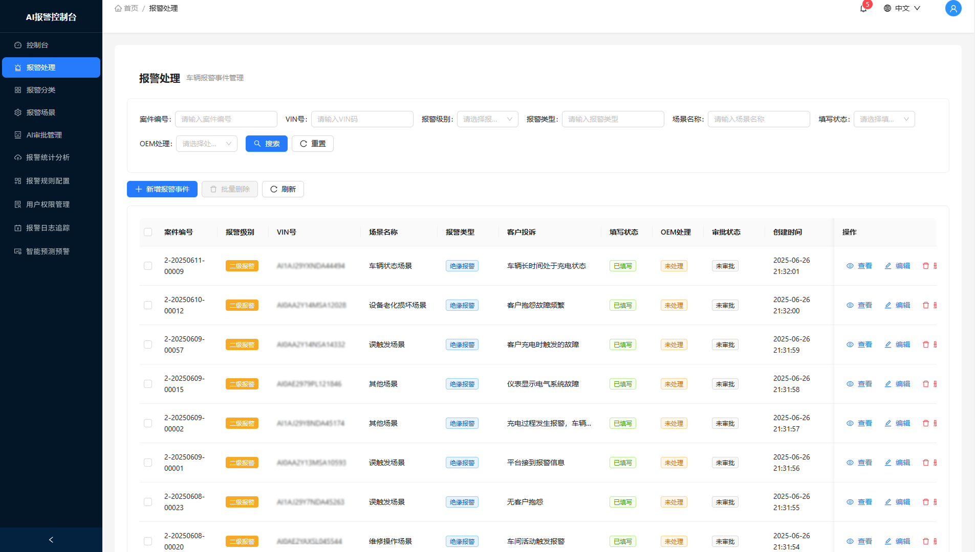 提供報警事件的全生命周期管理,支持多條件精準(zhǔn)搜索,并具備新增、批量刪除、刷新及對單條事件的查看、編輯等操作功能,確保處理流程高效流暢。