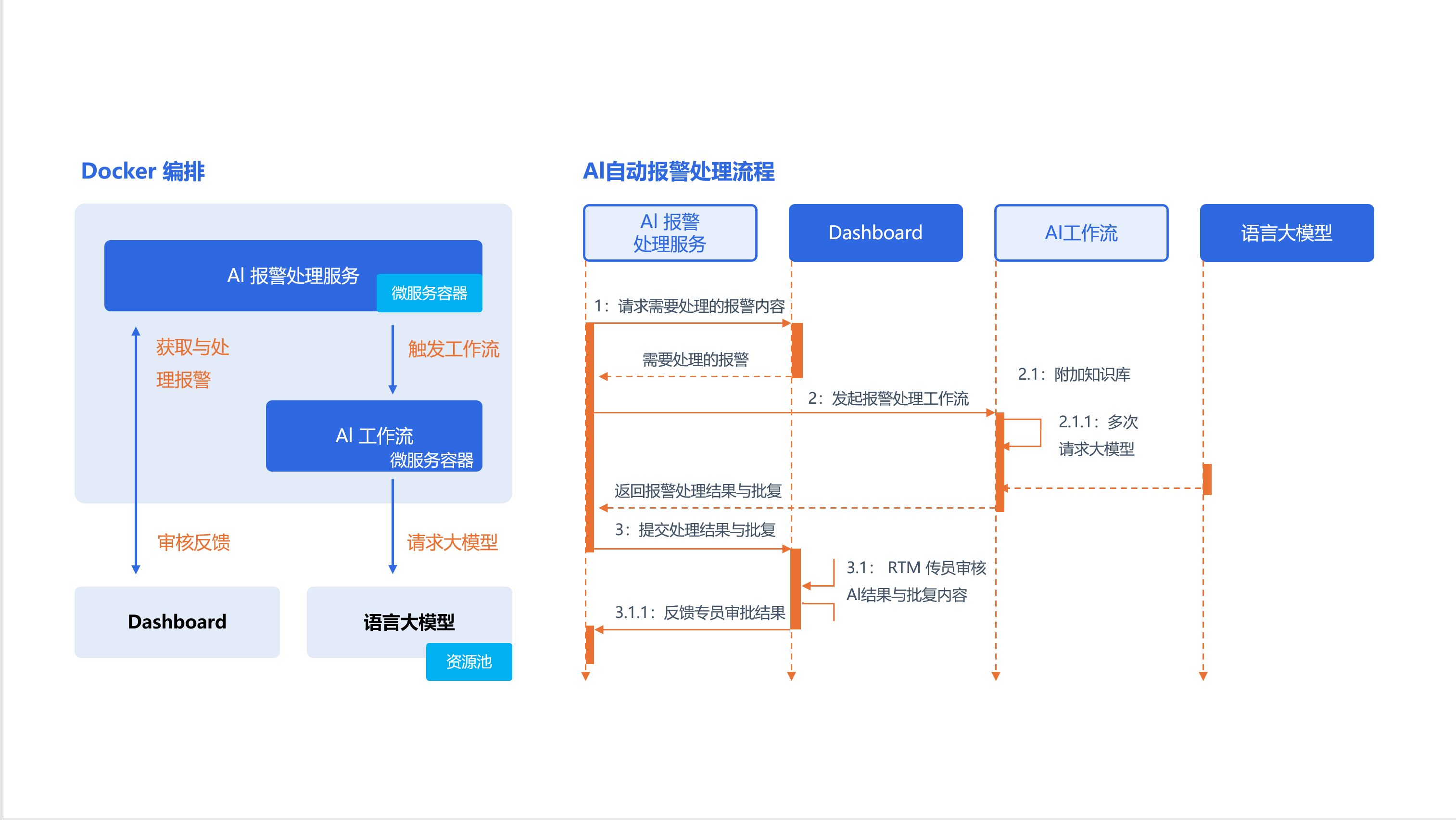 所有服務(wù)均部署于內(nèi)網(wǎng)環(huán)境,確保數(shù)據(jù)安全邊界。報警數(shù)據(jù)采集、AI處理與審核反饋全流程在內(nèi)網(wǎng)閉環(huán)流轉(zhuǎn),保障業(yè)務(wù)數(shù)據(jù)不外泄。AI能力依托主機(jī)廠提供的指定參數(shù)量與API規(guī)格的大語言模型,以微服務(wù)容器化方式驅(qū)動智能報警分析與決策。POC階段聚焦核心流程驗(yàn)證,暫不引入知識庫構(gòu)建,通過定義清晰的AI工作流與大模型交互機(jī)制,實(shí)現(xiàn)從報警觸發(fā)到審核批復(fù)的自動化處理閉環(huán)。