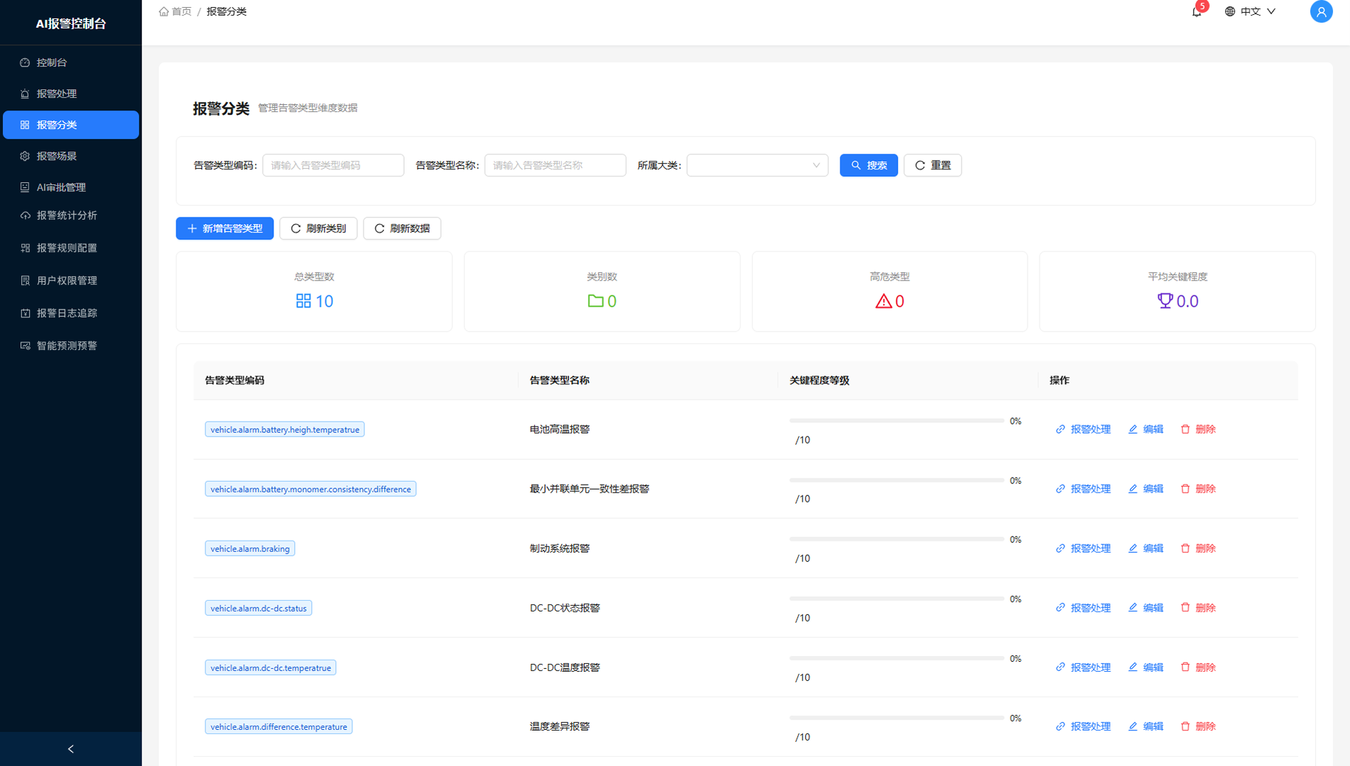 用于維護(hù)告警類型維度數(shù)據(jù),支持按關(guān)鍵字段搜索與新增類型,同時展示分類統(tǒng)計(jì)看板,方便對各類告警進(jìn)行統(tǒng)一配置與管理。