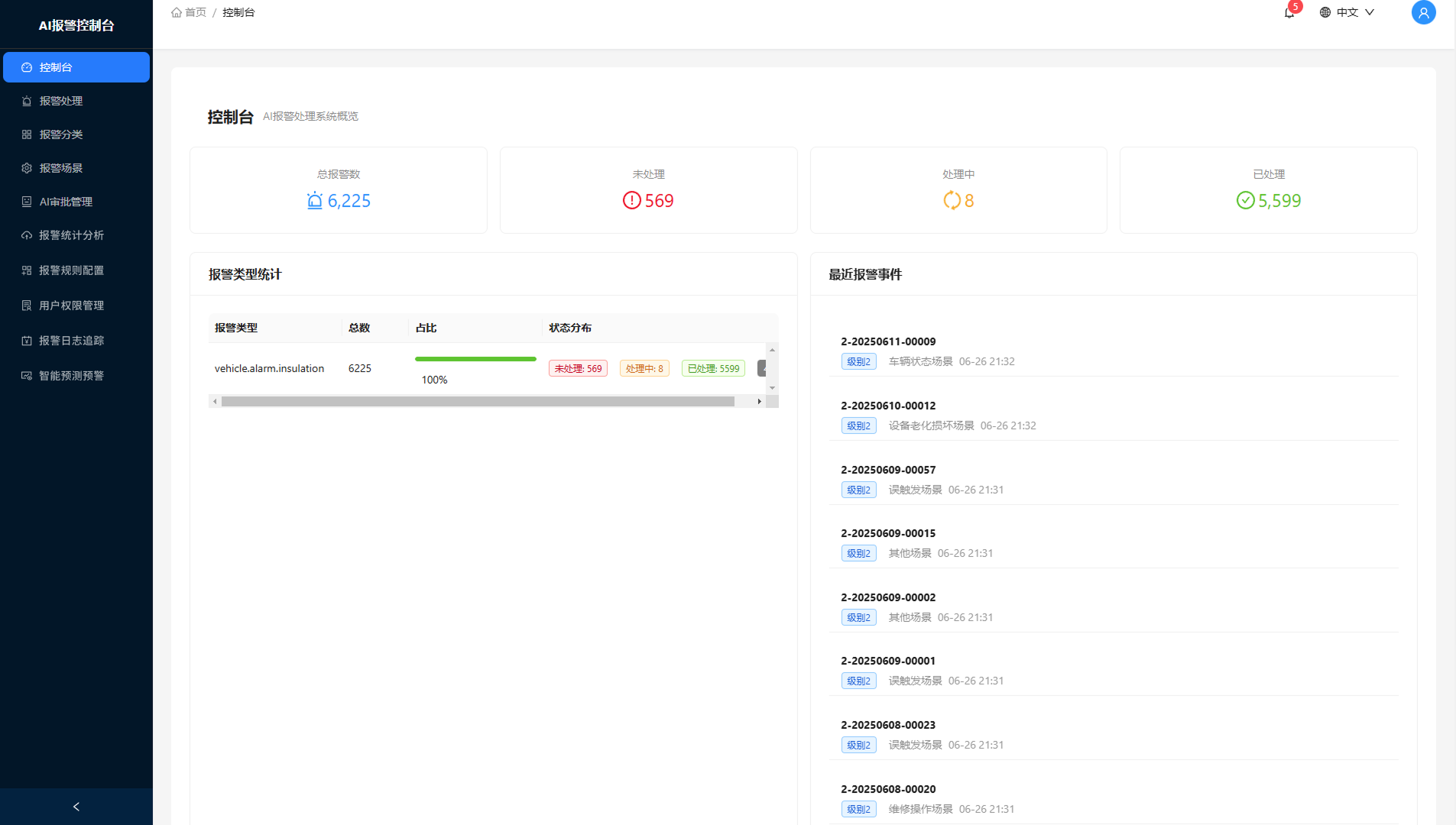 集中展示核心報警數(shù)據(jù)概覽與統(tǒng)計(jì),實(shí)時呈現(xiàn)未處理、處理中及已處理報警數(shù)量、類型分布與最新事件列表,為全局監(jiān)控與決策提供直觀數(shù)據(jù)支撐。