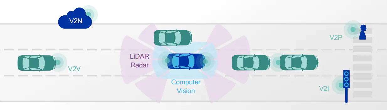 C-V2X提供兩種互補的傳輸模式,分別適用與車輛間鄰近和遠(yuǎn)離的情況。