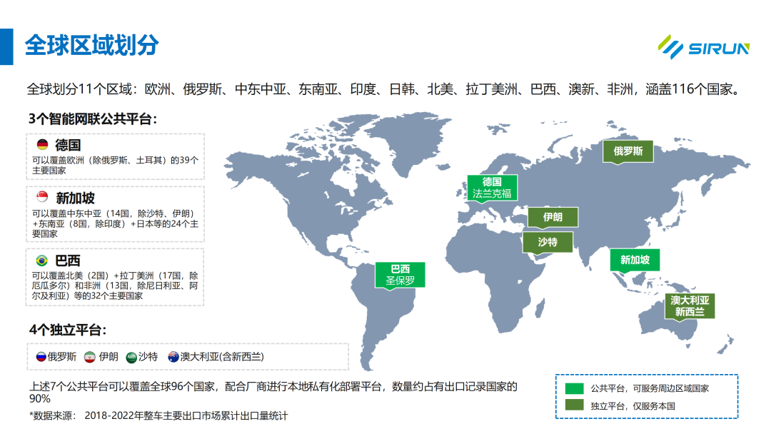 自成立以來,斯?jié)櫶炖室褏f(xié)助國內(nèi)車企成功交付多個海外項目,涵蓋北美、俄羅斯、歐洲、中東及東南亞等地。通過對主要汽車出口目標國的出口份額占比分析,同時結(jié)合斯?jié)櫶炖实暮M忭椖柯涞亟?jīng)驗和全球主要國家的數(shù)據(jù)法規(guī)調(diào)研結(jié)果,我們發(fā)現(xiàn),在德國、新加坡、巴西、俄羅斯、伊朗、沙特和澳大利亞等國構(gòu)建智能網(wǎng)聯(lián)開放平臺可以覆蓋90%以上的汽車出口目標國家,實現(xiàn)快速全球化布局。便捷的車輛接入模式使得自主品牌車企能以較快的速度實現(xiàn)在出海目的地的網(wǎng)聯(lián)覆蓋,有效幫助車企在海外市場降低成本,提高產(chǎn)品競爭力,實現(xiàn)智能化出海的愿景。