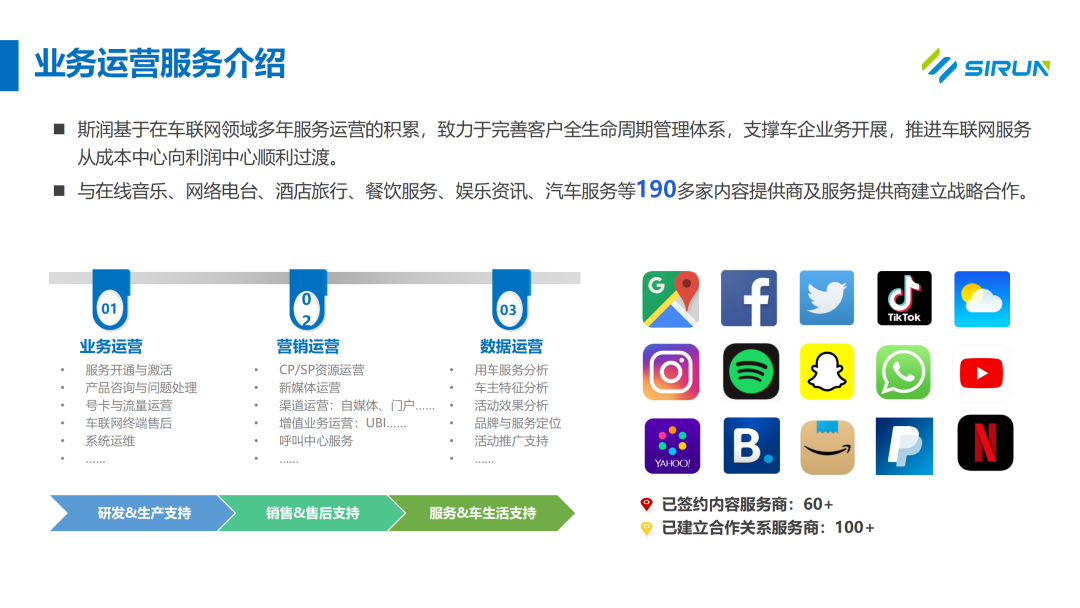 斯?jié)櫶炖首鳛槿蛸Y深的車聯(lián)網(wǎng)運營服務(wù)廠商,擁有全球節(jié)點的車聯(lián)網(wǎng)部署運營服務(wù)經(jīng)驗,可以為車企提供全球運維服務(wù)保障。斯?jié)櫶炖示邆湄S富的國際化業(yè)務(wù)和全球化業(yè)務(wù)構(gòu)建經(jīng)驗,可以滿足不同地區(qū)政策法規(guī)要求,并提供完整的車聯(lián)網(wǎng)服務(wù)和全球運維服務(wù)保障,為車企的國際化業(yè)務(wù)發(fā)展提供強有力的支持。