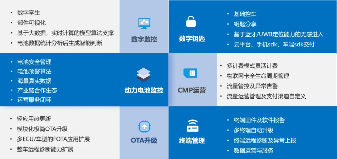 智能網(wǎng)聯(lián)開(kāi)放平臺(tái)是斯?jié)櫶炖蚀蛟斓钠?chē)智能網(wǎng)聯(lián)及應(yīng)用服務(wù)聚合平臺(tái),通過(guò)接入、協(xié)議、數(shù)據(jù)、應(yīng)用、服務(wù)等五大標(biāo)準(zhǔn)化技術(shù)體系以及強(qiáng)大的大數(shù)據(jù)底座,為用戶(hù)提供了200+ For Car組件化服務(wù),涵蓋監(jiān)控應(yīng)用、動(dòng)力電池監(jiān)控、數(shù)字鑰匙、終端管理、OTA升級(jí)、CMP運(yùn)營(yíng)等多個(gè)維度。平臺(tái)支持多種終端集成,確保上層應(yīng)用能夠根據(jù)車(chē)輛、終端、BMS整車(chē)單元的實(shí)際需求進(jìn)行靈活的服務(wù)擴(kuò)展。